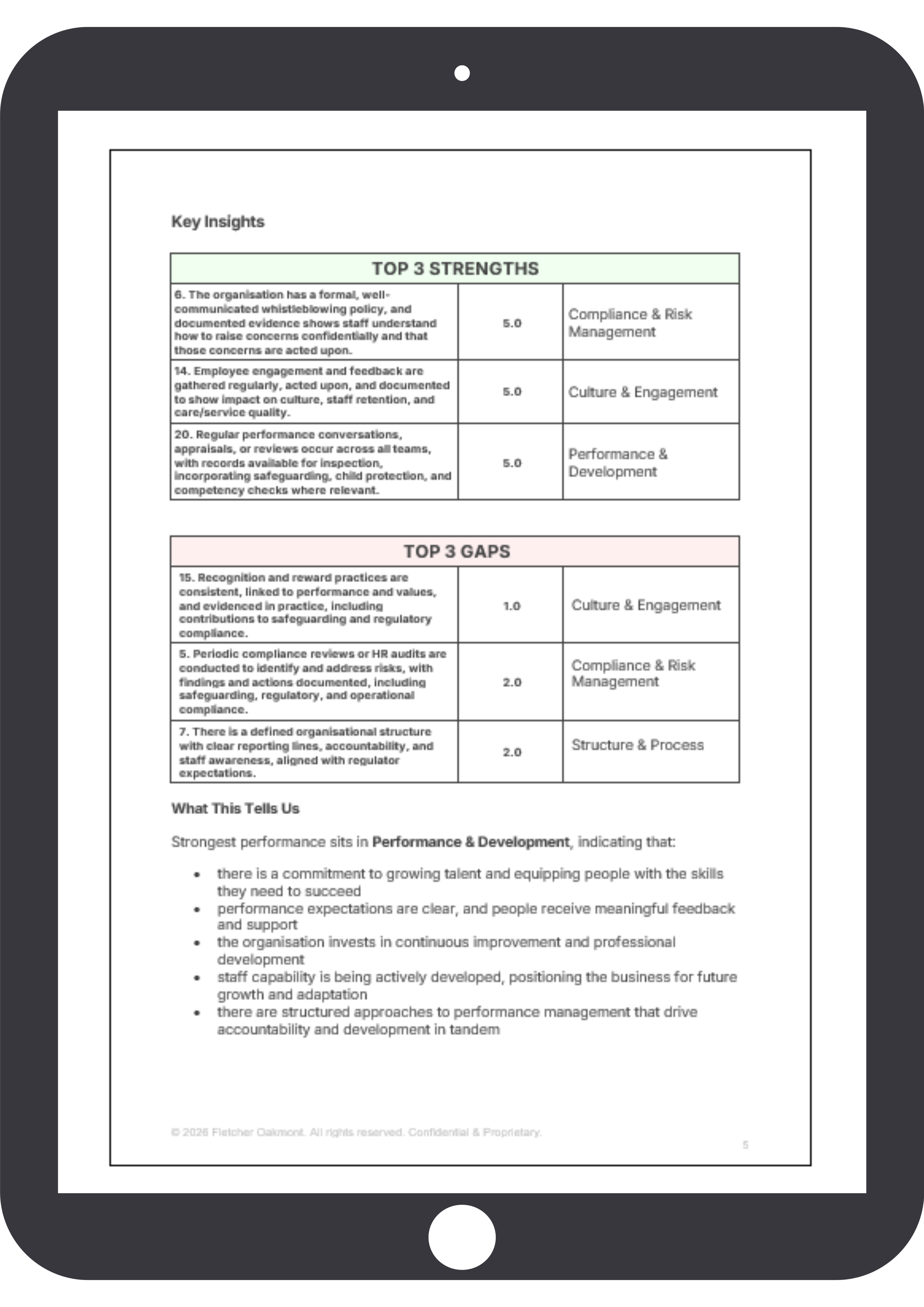 | Good | 63–87% | Robust governance with reliable people practices. Minor, targeted improvements will strengthen consistency and audit-ready evidence. |