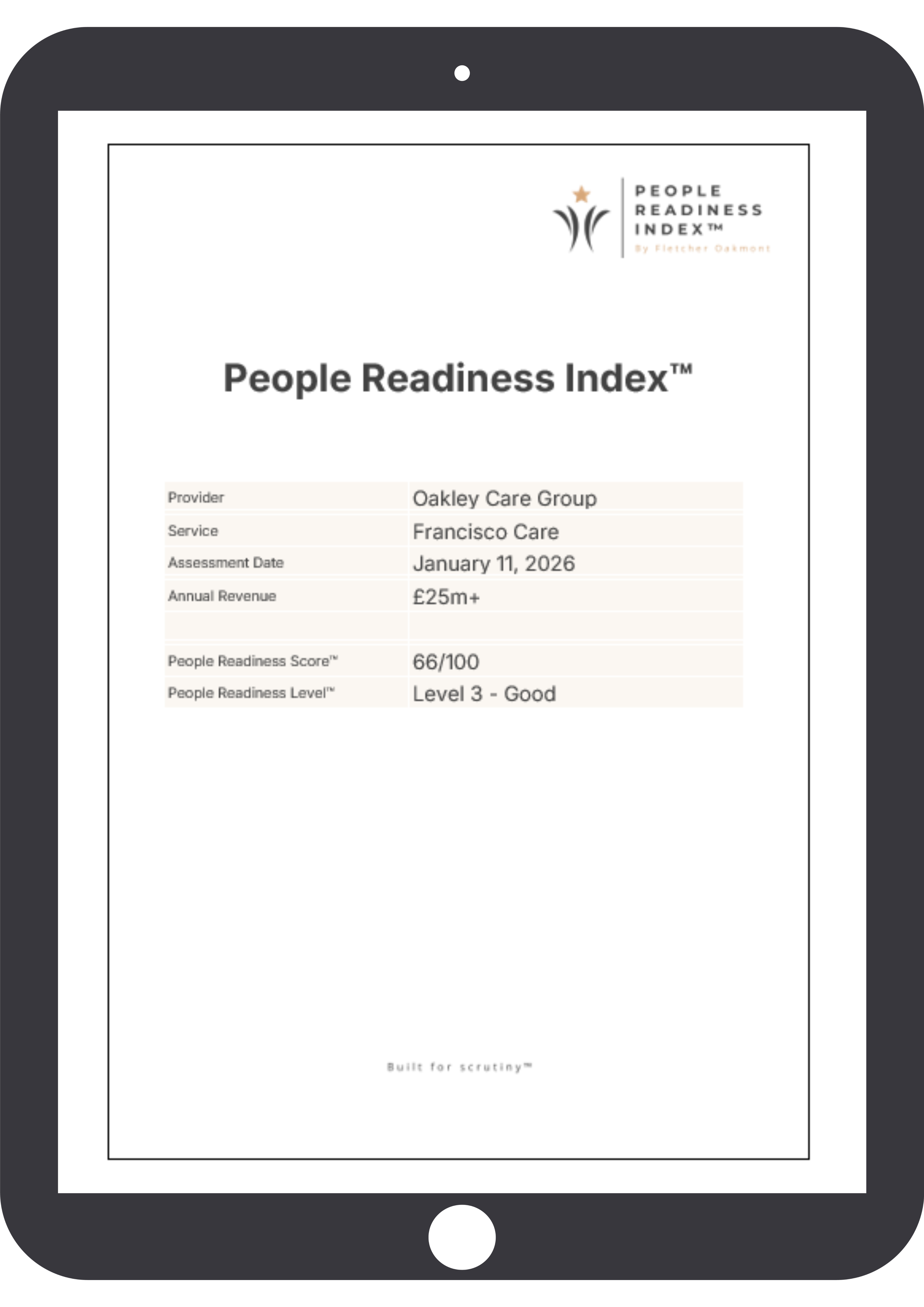 The People Readiness Index™ is a readiness diagnostic and does not predict or guarantee a specific CQC, Ofsted, or Care Inspectorate outcome.